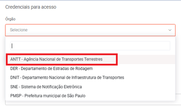 4. No campo "Órgão", selecione ANTT - Agência Nacional de Transportes Terrestres.
