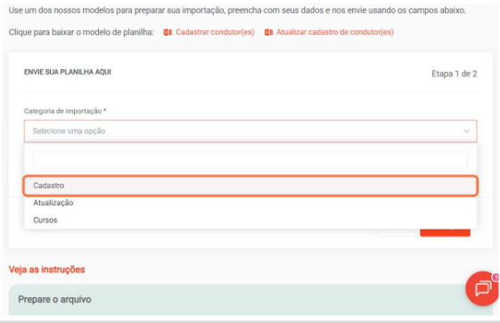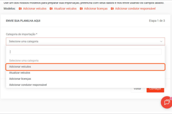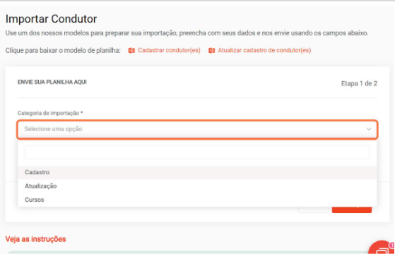 como fazer ações em massa como: Cadastrar condutor em massa, Alterar condutores em massa, Cadastrar Placas em massa, Alterar Placas em massa e Excluir Placas em massa