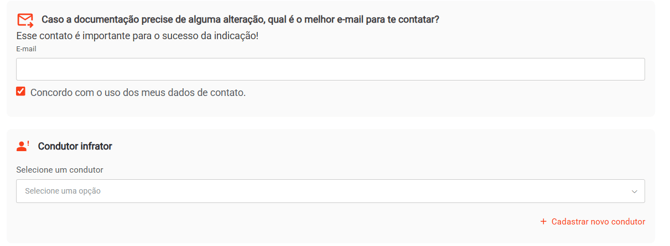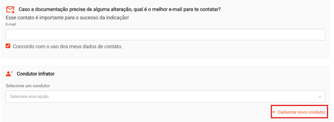 - Preencha o campo com seu e-mail (Para te atualizarmos sempre que houver uma novidade sobre a indicação) e selecione o condutor responsável